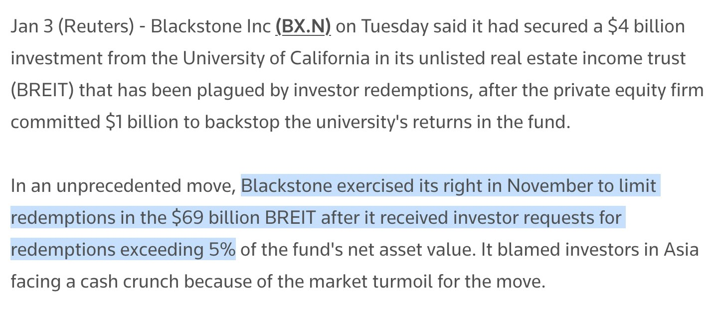Some of the largest nontraded REIT funds that have performed wonderfully in recent years have had to pause redemptions as investors have been attempting to pull their money out en masse. Blackstone closed the exit doors on their $69B BRIET product before getting a $4B capital injection from the University of California. Similarly Starwood Real Estate Income Trust curbed their redemptions after the limit was hit in November. Both funds are saying that the redemptions are being driven by a desire from their current investors to take money off the table. But I'm reading it as a signal that these investors are turning extremely bearish on commercial real estate as layoffs at big tech firms have become the latest fashion. Why keep your money locked in a fund looking to eek returns out of tech companies who need office space if they're clearing out their offices?