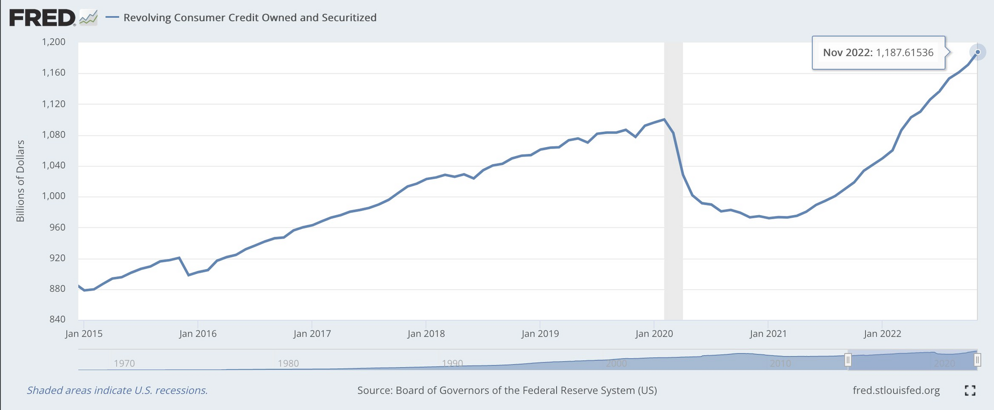As inflation has soared over the last year, so has consumer credit. The average American is finding it hard to get by and has been forced to load up their credit card to get by. One may point out that consumer credit has always been expanding pretty consistently since the 1970s without any material slowdowns outside of the Great Financial Crisis of 2008/2009 and the COVID lockdowns from a few years ago, and this would be a valid point. However, if you look at the slope of the latest run up in consumer credit that commenced in the middle of 2021 when the economy began to open back up you may notice that the slope of the increase is a bit steeper compared to the run up that began in earnest in 2013/2014.