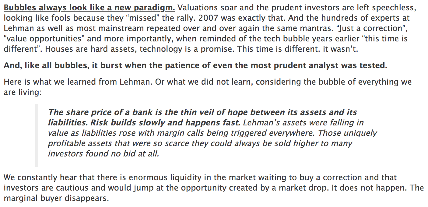 It's been real slow around these parts outside of the Attorneys General report that dropped earlier this week, a Japanese exchange getting hacked, and the volatile intraday price action in Bitcoin yesterday that had some people screaming "MANIPULATION", so I figured I'd wander off the beaten path and talk about lessons we can glean from the Lehman collapse and subsequent recession. As you can see from the snippet above taken from this great piece on Zerohedge, some eerily similar themes played out in the bubble fueled by mortgage-backed securities and the one we witnessed last year fueled by ICOs and other affinity scams.