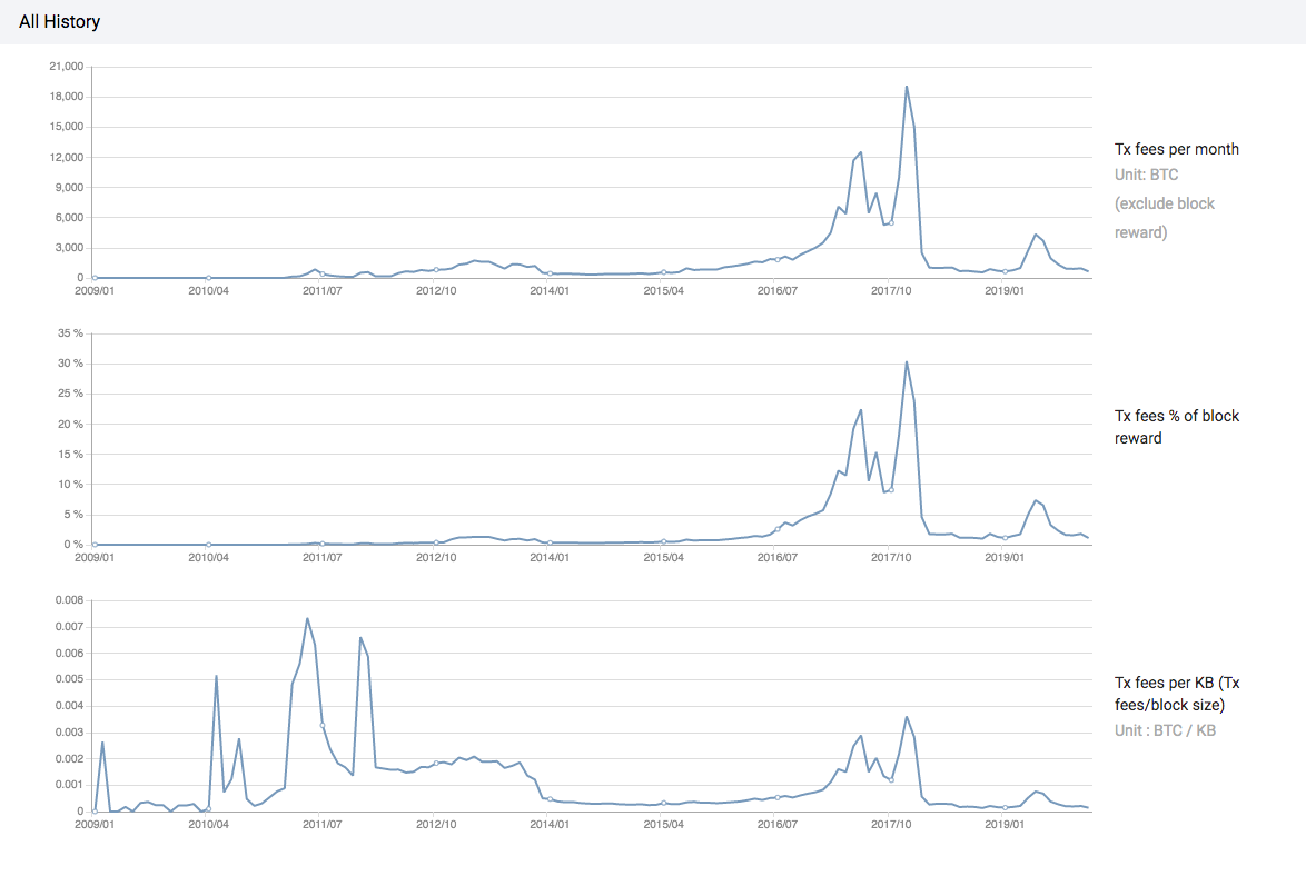 Fees accounted for 1.1% of total block rewards collected by bitcoin miners last month. Rookie numbers. A far cry from the peak of 30.40% recorded two years earlier in December 2017. During the height of the ICO mania and bitcoin blow off top. This is a product of many factors including; the fact that we're not in the midst of a mania, protocol efficiencies have been made, better batching practices have been implemented by big economic players within the network, and better fee estimating tools within wallets, among other things.