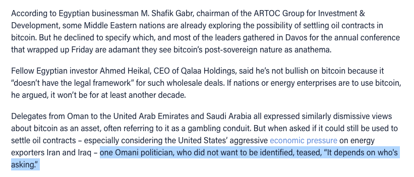 Though, believe it or not, your Uncle Marty isn't here to lambast these charlatans today. They are simply noisy clout chasers who will be forgotten in history. To me, the signal from this circle jerk came from comments about whether or not oil contracts will be (or are already being) denominated in bitcoin. CoinDesk's Leigh Cuen covered comments from several representatives from the Middle East with heavy oil ties about their thoughts on bitcoin-settled oil contracts.