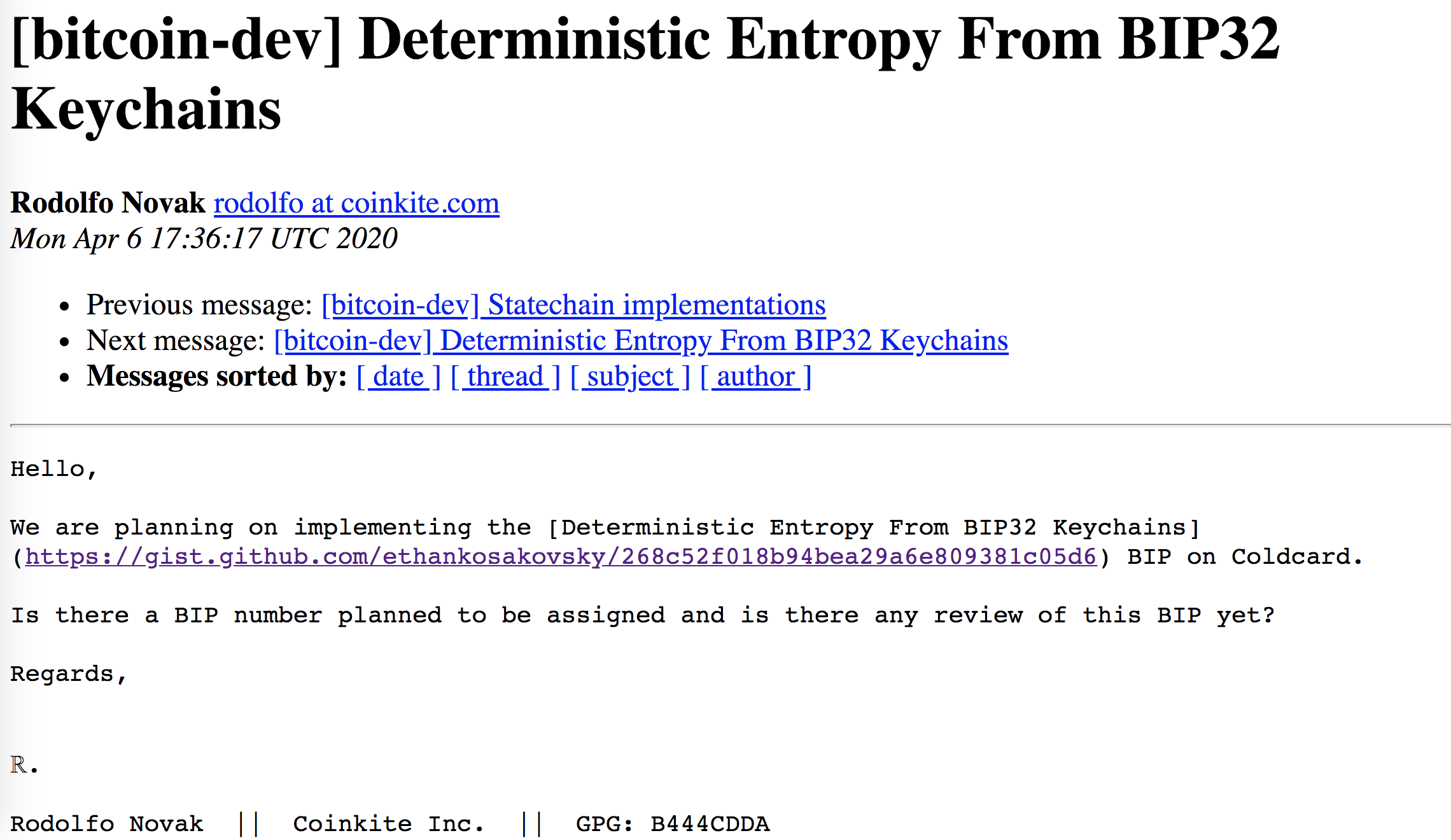 Here's something from the bitcoin-dev mailing list that caught my eye the other day, the implementation of a private key keychain on a Coldcard hardware wallet. This would allow individuals to create and store multiple private keys on a single device that could then be restored on other wallets. A quality offline seed generator with a single backup. This would make things easier for users and business who use multiple wallets and don't want the hassle of having to store their private keys in different places. Essentially helping to streamline things.