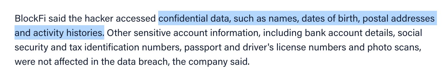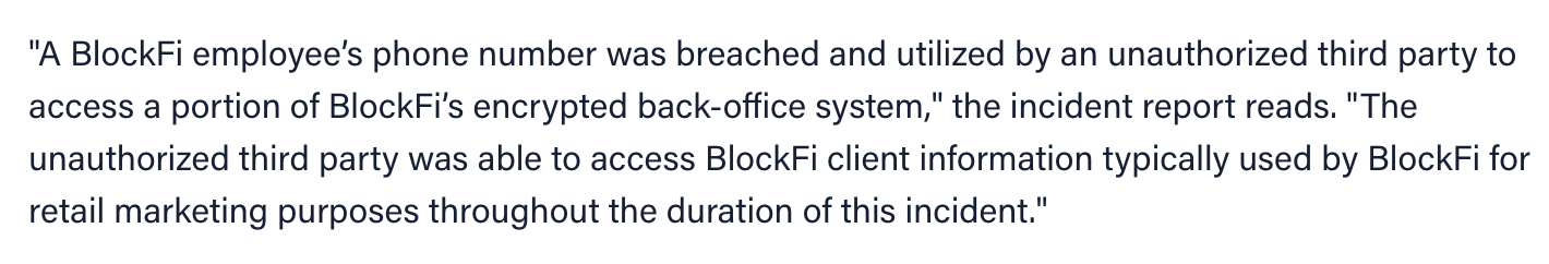 It's really shitty that this happened to BlockFi and their customers. Here's to hoping this provides a teachable moment for everyone building custodial products for bitcoiners. KYC/AML does more harm than good and SMS 2FA should be avoided at all costs. Companies should take the least amount of data that is necessary and even fight back against draconian regulations that force them to collect and hold sensitive data because it is becoming more and more of a liability. They shouldn't be put in a position where they can put their customers in harms way because they are forced to collect personal data.