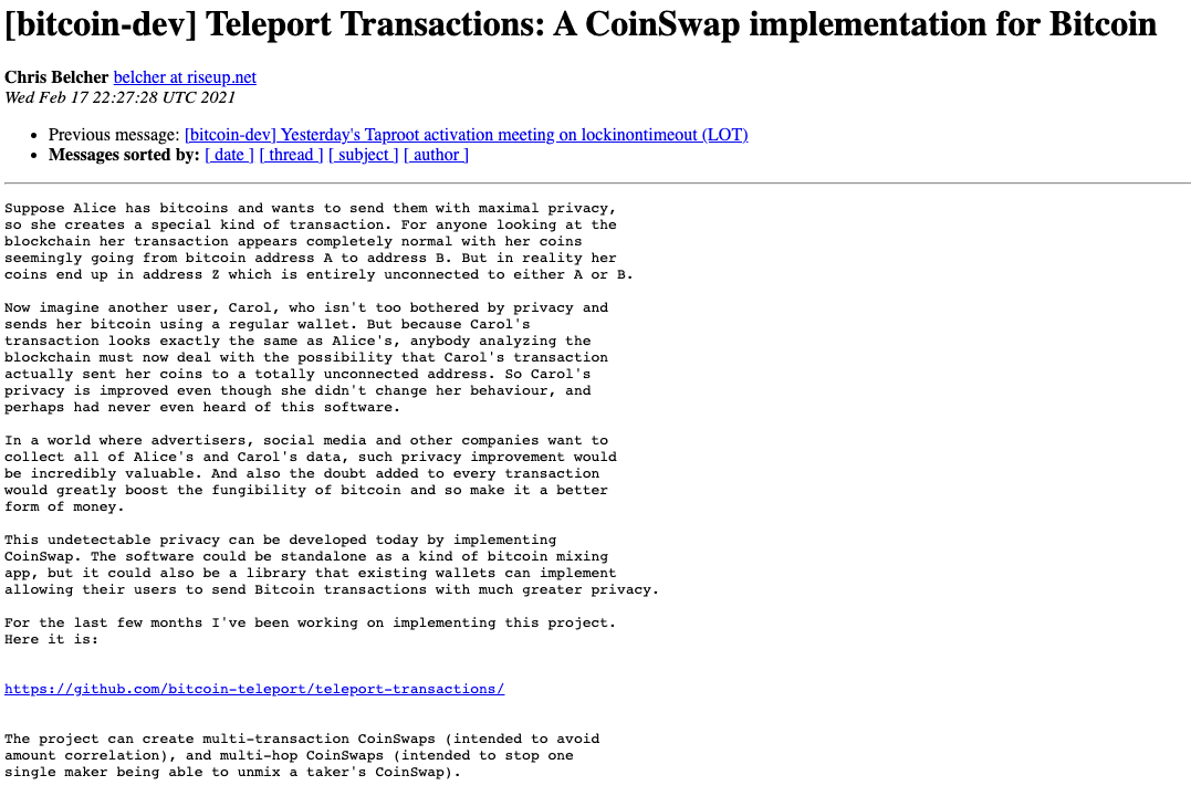 Towards the end of May 2020, we made you freaks aware of the fact that Chris Belcher had released the first ever design spec of a CoinSwap implementation; a way for individuals to preserve privacy while transacting on the Bitcoin network by confusing common heuristics used by chain analysis companies. In December, we were there to inform you of the fact that a CoinSwap transaction had been successfully executed on Bitcoin's testnet. And today, late into the nigh on the East coast, we are here to celebrate the fact that Chris Belcher has officially taken to the bitcoin-dev mailing list to unveil Teleport Transactions: a CoinSwap implementation for Bitcoin.