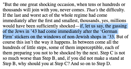 I woke up this morning and saw this tweet from Michael Krieger urging his followers to read an excerpt from They Thought They Were Free The Germans, 1933-45 and I am very happy that he did so. We talk a lot about the gradually, then suddenly nature of Bitcoin acceptance, adoption and domination. Today, I'd like to turn your attention towards another gradually, then suddenly trend we follow from time to time in this rag but needs more attention at this current juncture; the slow creep towards Authoritarianism. We've touched on isolated instances of this slow creep in many issues throughout the past, but I'd like to attempt to bring some of these disparate instances into hyper focus using this retrospective on Nazi Germany as a guide to help highlight how we may be embarking on a similar path at the moment.