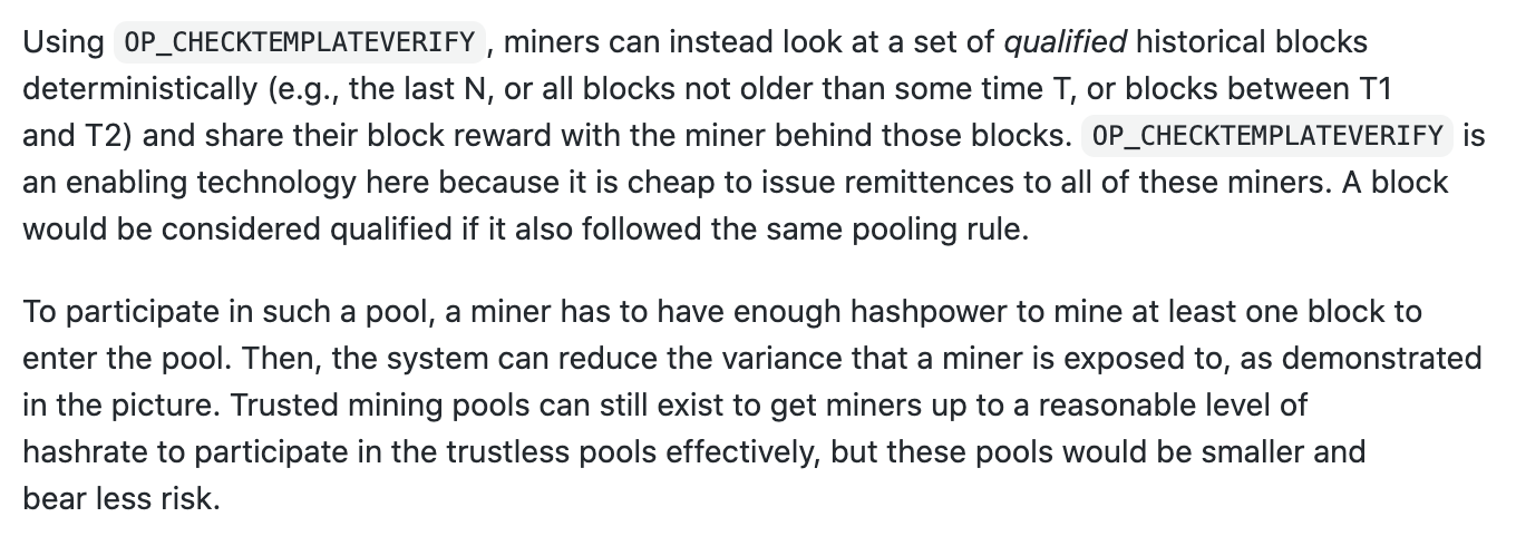 It will also be an extremely useful framework to leverage if BIP 119 or some other route gets OP_CTV merged into Core. Above is but one example of something desperately needed in Bitcoin if it is to be sufficiently distributed and censorship-resistant in the future; a decentralized mining pool that allows individual miners to distribute coinbase rewards. The expressiveness of the covenants that are enabled by OP_CTV is pretty mind blowing when you begin applying it to certain use cases. A decentralized mining pool payout scheme is only the tip of the ice berg.