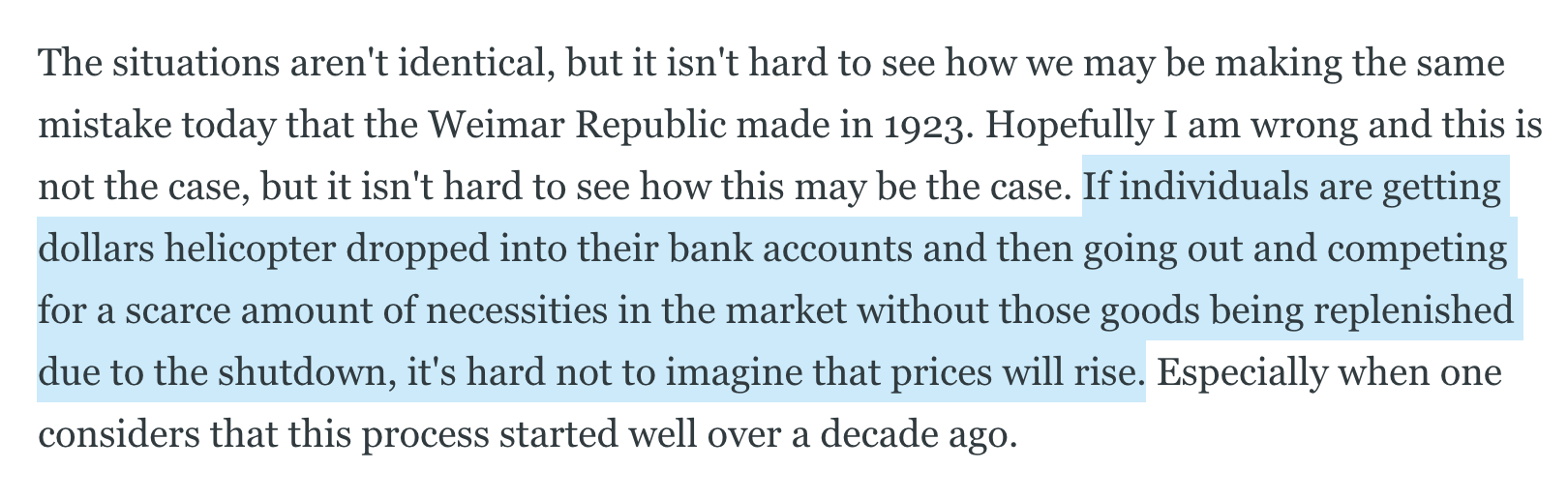 On April 7th, 2020 your Uncle Marty wrote an issue of this rag titled A warning from history. At the time, the world was in a panic and governments were shutting down whole economies to "flatten the curve" while promising to make up for the lack of income provided by the jobs that were forced to a halt by printing money and airdropping it in plebs' bank accounts. Many were cheering these actions on, but they caused us at the Bent to take pause and reflect on history. Particularly the events that unfolded in the Weimar Republic when they did something similar in reaction to the French occupation of their cities. Here's a excerpt from that rag: