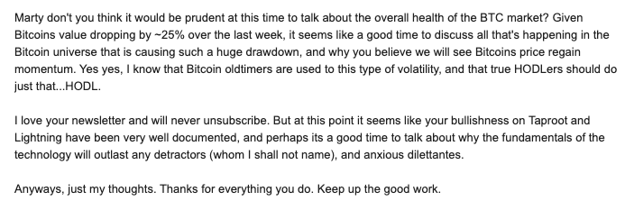 I love your newsletter and will never unsubscribe. But at this point it seems like your bullishness on Taproot and Lightning have been very well documented, and perhaps its a good time to talk about why the fundamentals of the technology will outlast any detractors (whom I shall not name), and anxious dilettantes.
