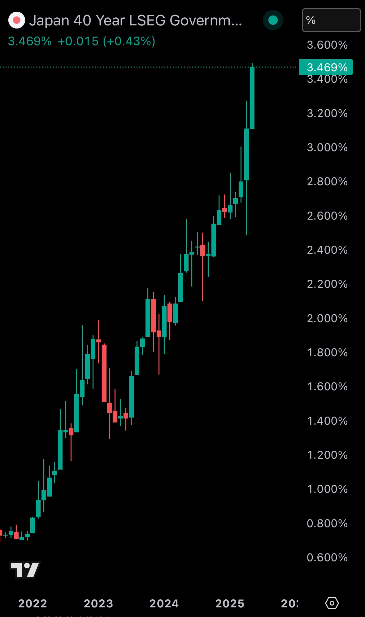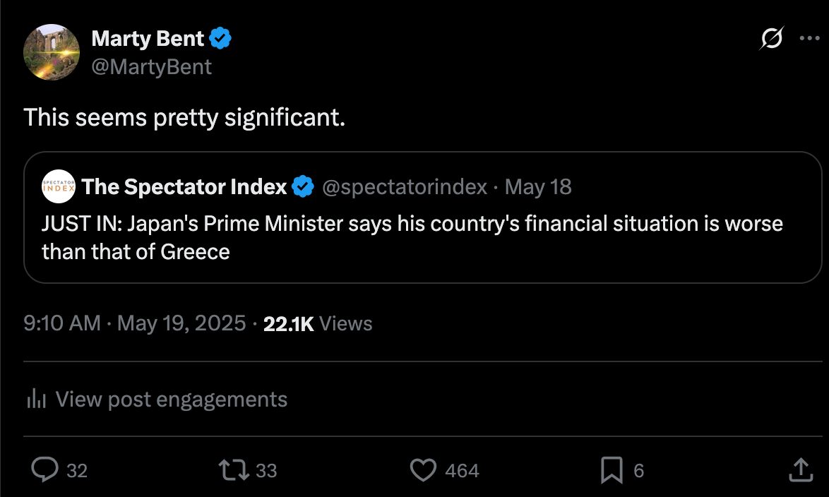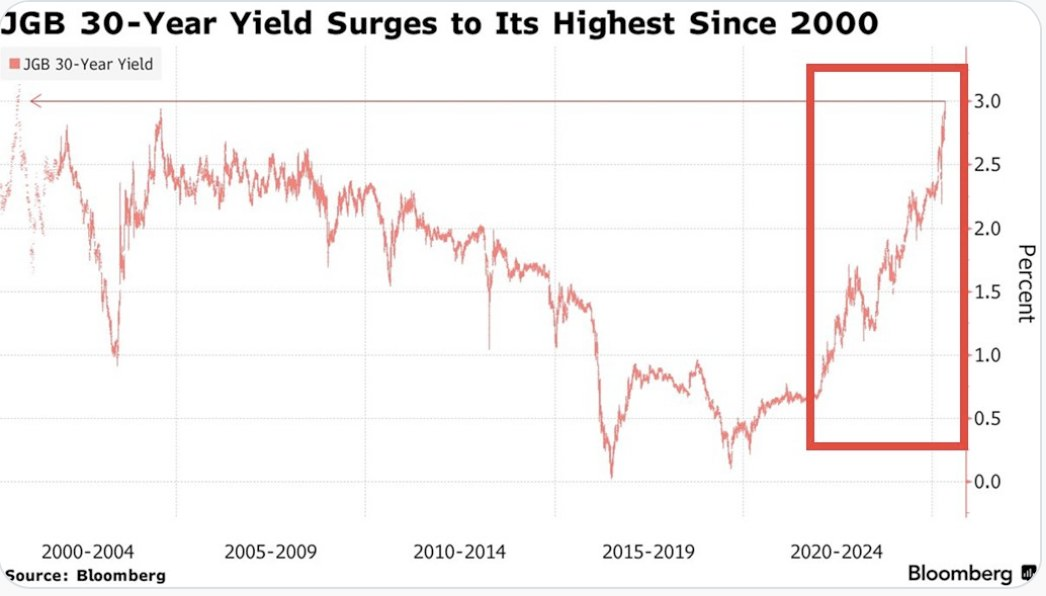 Don't sleep on what's happening in Japan right now. We've been covering the country and the fact that they've lost control of their yield curve since late last year. After many years of making it a top priority from a monetary policy perspective, last year the Bank of Japan decided to give up on yield curve control in an attempt to reel inflation. This has sent yields for the 30-year and 40-year Japanese government bonds to levels not seen since the early 2000s in the case of the 30-year and levels never before seen for the 40-year, which was launched in 2007. With a debt to GDP ratio that has surpassed 250% and a population that is aging out with an insufficient amount of births to replace the aging workforce, it's hard to see how Japan can get out of this conundrum without some sort of economic collapse.