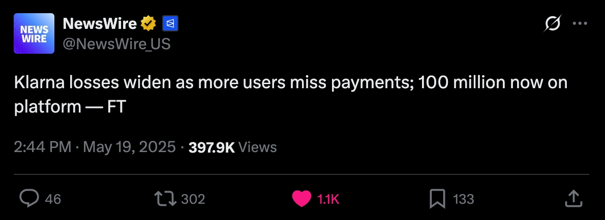This is even made clear when you look at the private sector, particularly at consumer debt. In late March, we warned of the growing trend of buy now, pay later schemes drifting down market as major credit card companies released charge-off data which showed charge-off rates reaching levels not seen since the 2008 great financial crisis. At the time, we could only surmise that Klarna was experiencing similar charge-off rates on the bigger-ticket items they financed and started doing deals with companies like DoorDash to finance burrito deliveries in an attempt to move down market to finance smaller ticket items with a higher potential of getting paid back. It seems like that inclination was correct as Klarna released data earlier today showing more losses on their book as consumers find it extremely hard to pay back their debts.