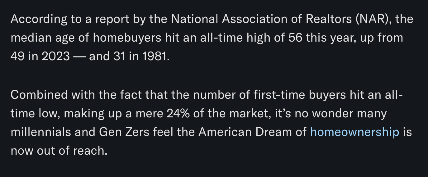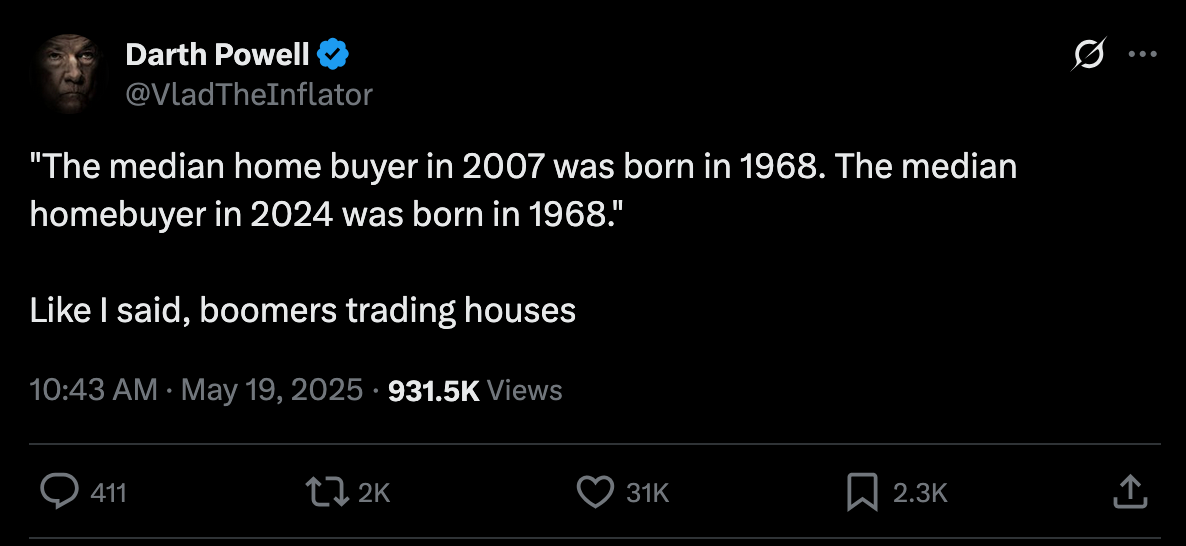 The mortgage rate data is not the only thing you need to look at to understand that it's becoming impossible for the Common Man of working age to buy a house. New data has recently been released that highlights That the median home buyer in 2007 was born in 1968, and the median home buyer in 2024 was born in 1968. Truly wild when you think of it. As our friend Darth Powell cheekily highlights below, we find ourselves in a situation where boomers are simply trading houses and the younger generations are becoming indentured slaves. Forever destined to rent because of the complete inability to afford to buy a house.