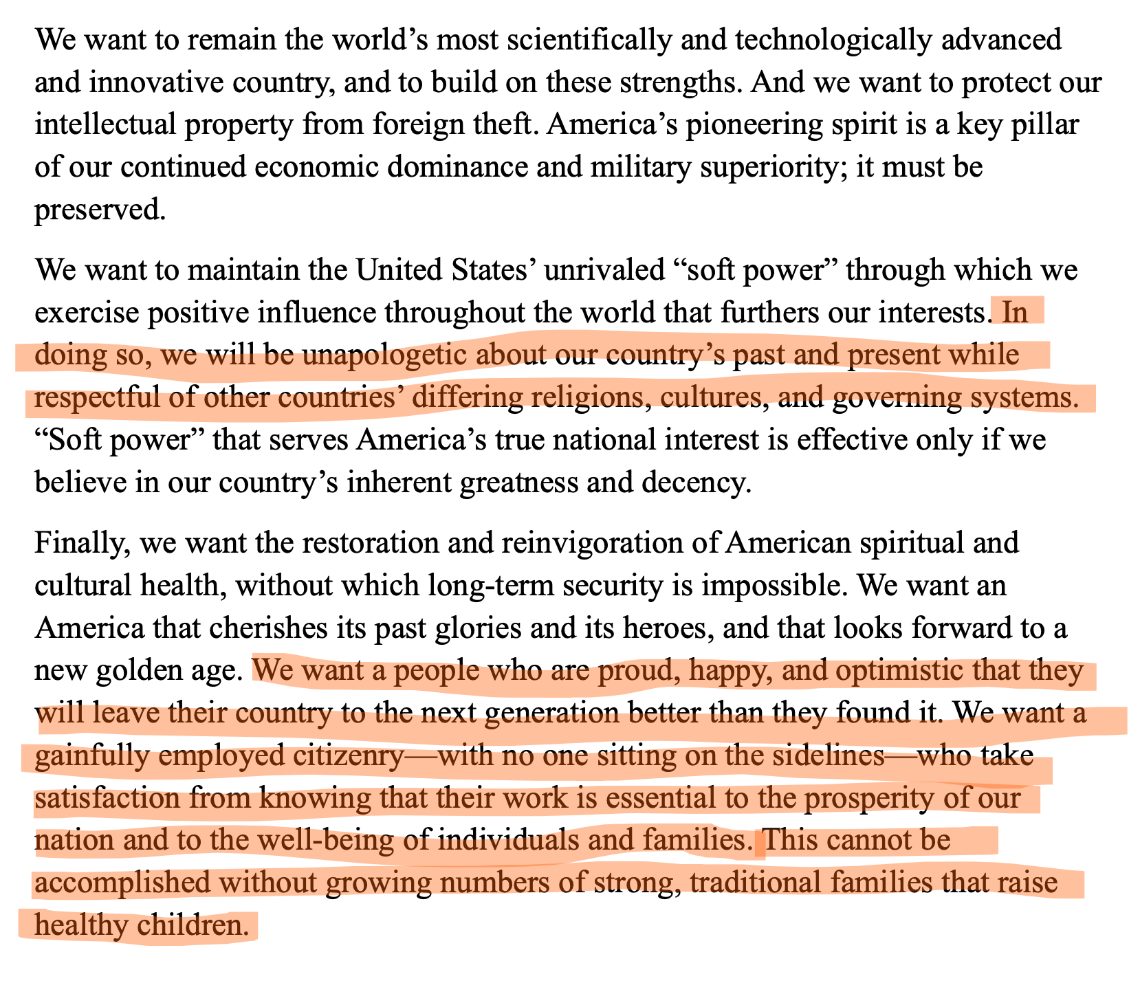 The two factors that (in my mind) contribute the most to one's view of whether or not they are living a dignified life are; being gainfully employed and to the extent that your wage can afford you the ability to raise a strong family. The focus on strong, traditional families cannot be overstated. Strong families are the cornerstone of a thriving society. I am very grateful that this has been identified and is a focus of our National Security Strategy. If we don't have strong families of people living dignified lives then what are we even trying to secure? A nihilistic society driven by hedonism and degeneracy. It's time to return to fundamentals and turn away from the nihilism that has poisoned our society.
