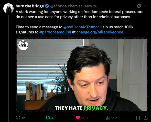 They do not care if you are a law abiding citizen. As Keonne describes in the clip above, if you are trying to do something privately the government will assume you are doing something nefarious and label you an enemy to be dealt with. This is especially true for the individuals who are so willing and bold to build tools that help other people achieve privacy.