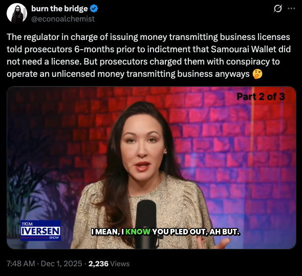 For those who are unaware, Keonne and Bill built the privacy-focused wallet Samourai Wallet which helped individuals obscure the linked history of their bitcoin transactions by participating in CoinJoins. Samourai Wallet was designed in a way that made it so Samourai never had custody of user funds as they were transacting. Despite this, the Department of Justice charged the two with operating a money transmission business, despite the fact that control of funds is necessary to be considered a money transmitter. Funnily enough, the prosecutors held a meeting with FinCen a few months before charging Keonne in Bill to get their opinion on whether or not they believed Samourai Wallet could be considered a money transmitter, to which they replied, "No, they don't custody funds." This meeting was not disclosed until midway through the trial process.