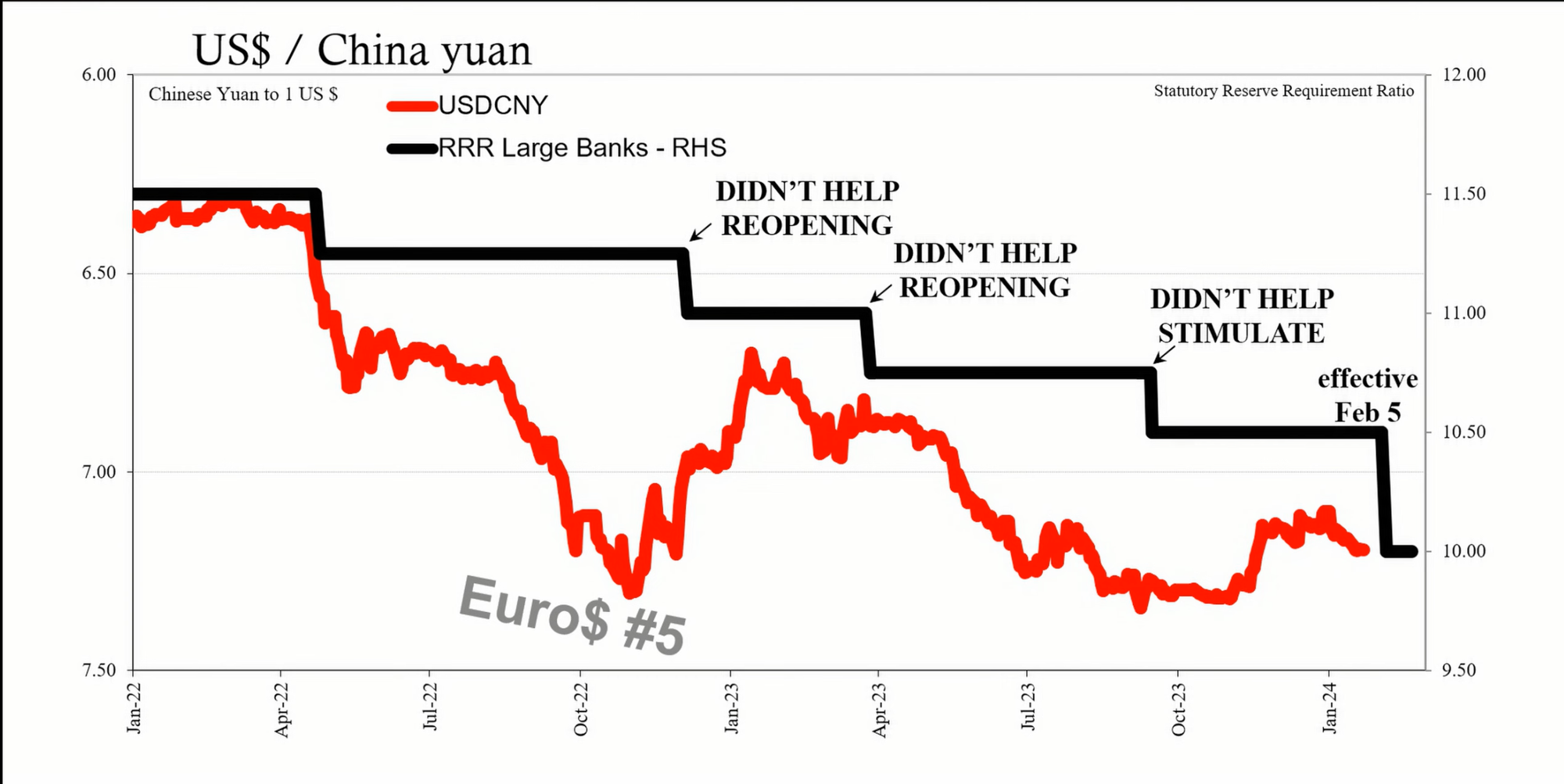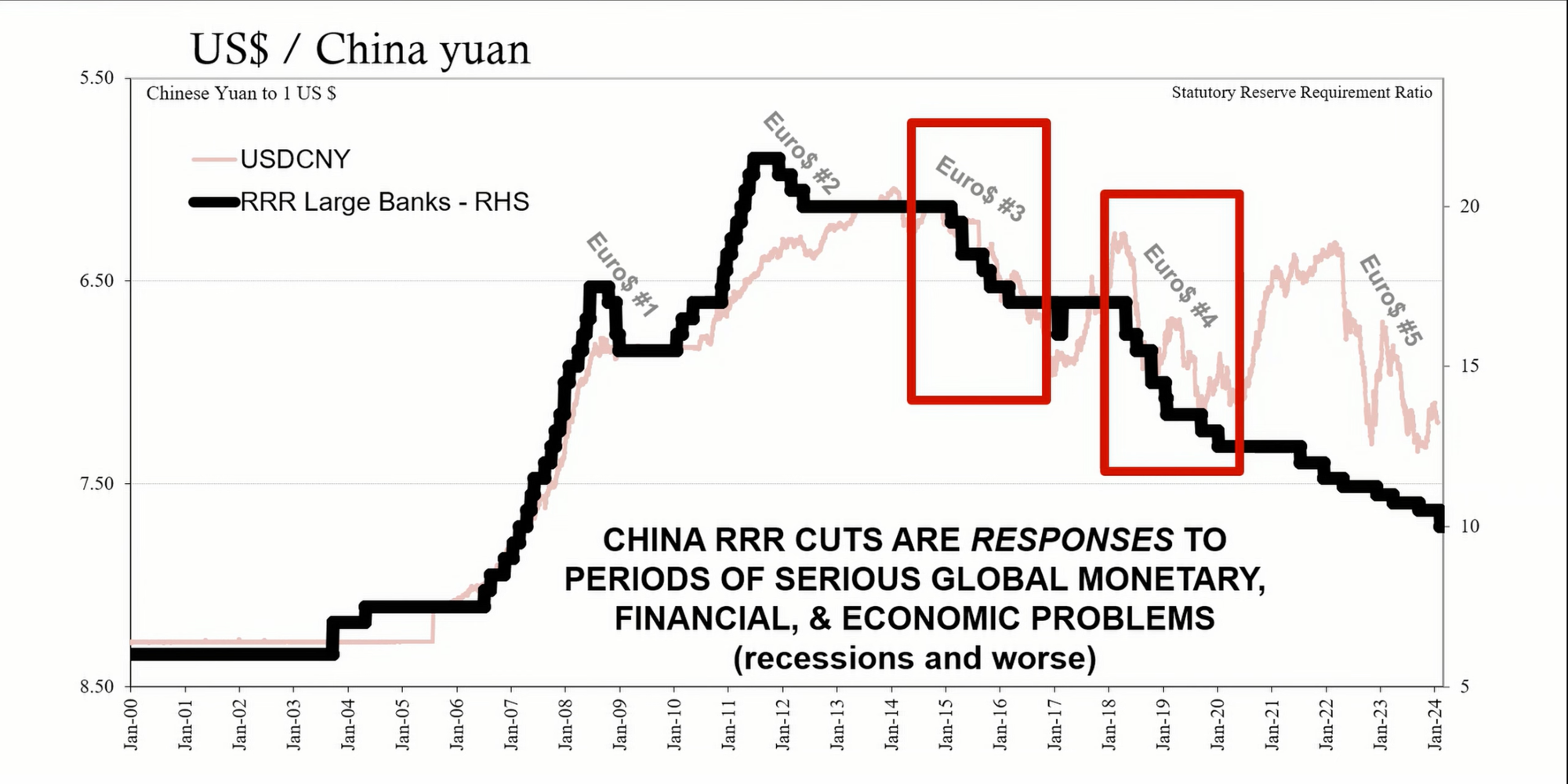 The RRR cut is designed to allow Chinese banks to use more of their cash holdings rather than keep it in reserve. The intention is to encourage banks to lend more and stimulate the economy. However, historical patterns suggest that RRR cuts are typically associated with periods of economic distress and are not necessarily stimulative. These cuts have occurred during challenging times, such as the euro dollar cycles of 2015-2016 and 2018-2019, and more recently in 2022.