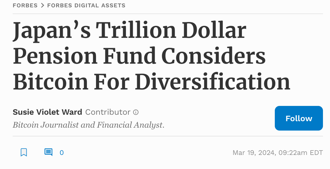 In all seriousness though, the fact that a $1.2 Trillion pension fund out of Japan has begun the diligence process on bitcoin should be a sign to every other pension around the world that the tock is clicking. Bitcoin isn't going anywhere and one of the big pension dominoes is eventually going to fall. Once it falls, animal spirits will take hold and others will inevitably follow. As more and more pensions follow the first domino a virtuous cycle the likes of which you have never seen before will begin to take hold and there will be many pension managers kicking themselves because they didn't move early enough.