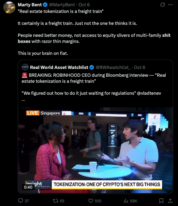 Individuals do not need access to equity slivers of multi-family shit boxes with razor thin margins. THEY NEED BETTER MONEY. Trying to push tokenization so that more people can speculate in the high velocity trash economy for financialized assets doesn't solve the core issue we face as a society today. It will only serve to exacerbate it as the unwitting retail masses treat speculating on multi-family residences in newly gentrified neighborhoods like their meme tokens on pump dot fun. People don't need more and easier ways to speculate. THEY NEED BETTER MONEY.