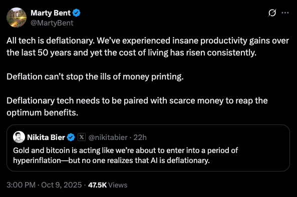 Tech deflation is certainly real, and it is certainly incredible for humanity. Unfortunately, humanity is not able to reap the full benefits of tech deflation because people are forced to fight the powerful forces of monetary inflation. If we want to live in a society where everyone has an exponentially higher chance of leading an extremely high quality life in which they can reap the full benefits offered by advances in technology, tech deflation needs to be paired with a deflationary money like bitcoin. As technology makes us more productive, expands the spectrum of potential goods and services that can be brought to the market relatively cheaply and pushes humanity forward, people should be able to buy more for less and save their excess productivity in a money that works for them, not against them.