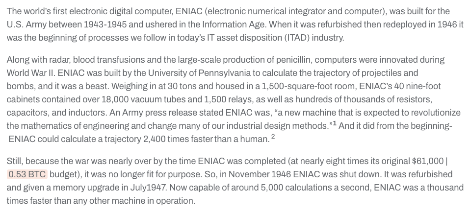 How do I know this is the case? Because it has always been the case. The other ironic thing about Nikita's tweet is that he seems to be completely oblivious to the fact that tech has always been deflationary and we have witnessed awe inspiring levels of tech deflation over the course of centuries. Here's a picture of the first ever computer that was built by the US Army.
