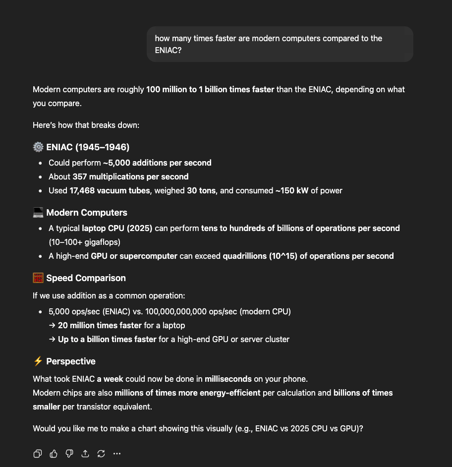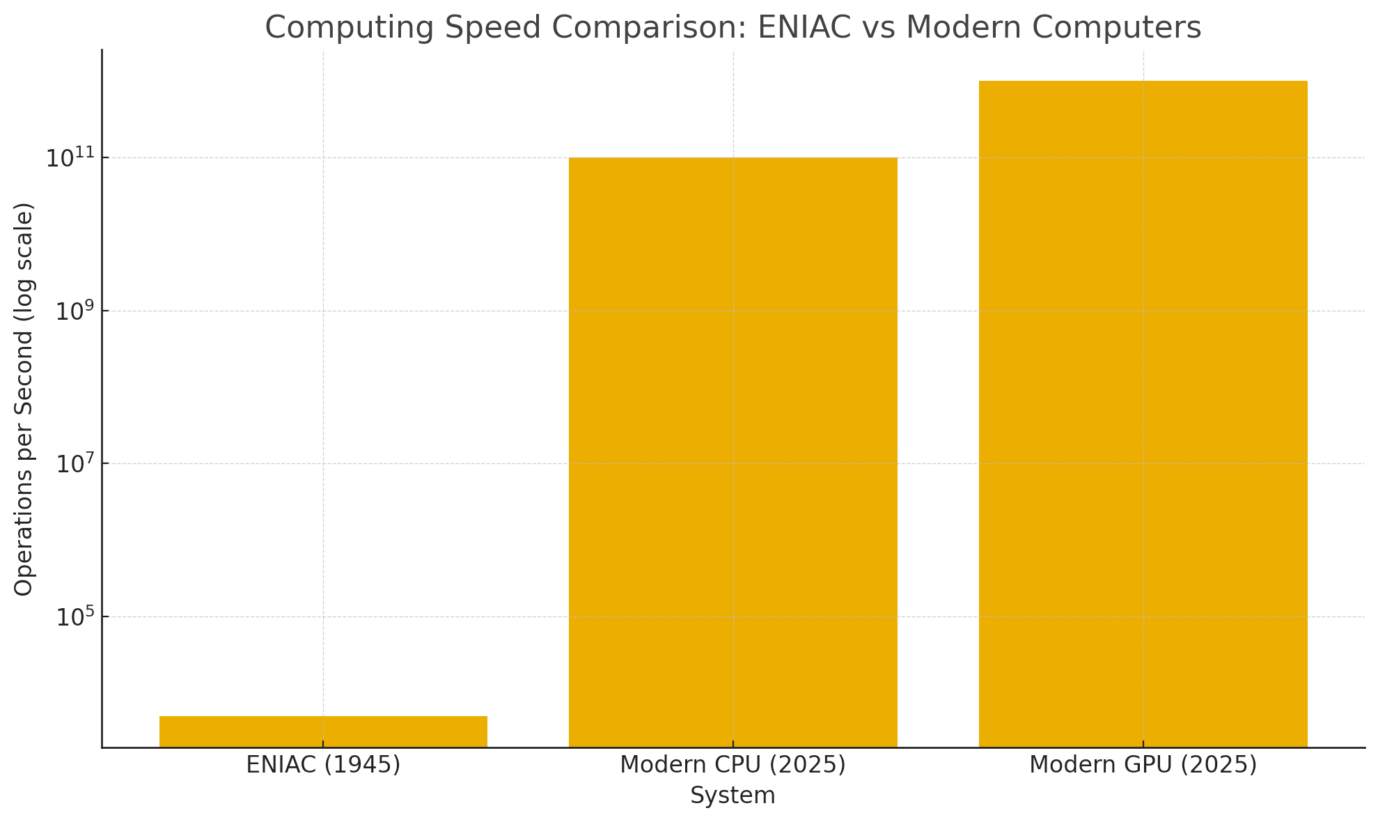 In today's inflation-adjusted dollars, it cost the US Army ~$8,000,000 to build this absolute unity in 1946. The ENIAC wouldn't be recognized as a computer by people living today. It would seem too dumb because computers have the luxury of using computers that are checks notes 100 million to 1 billion times faster than the ENIAC.