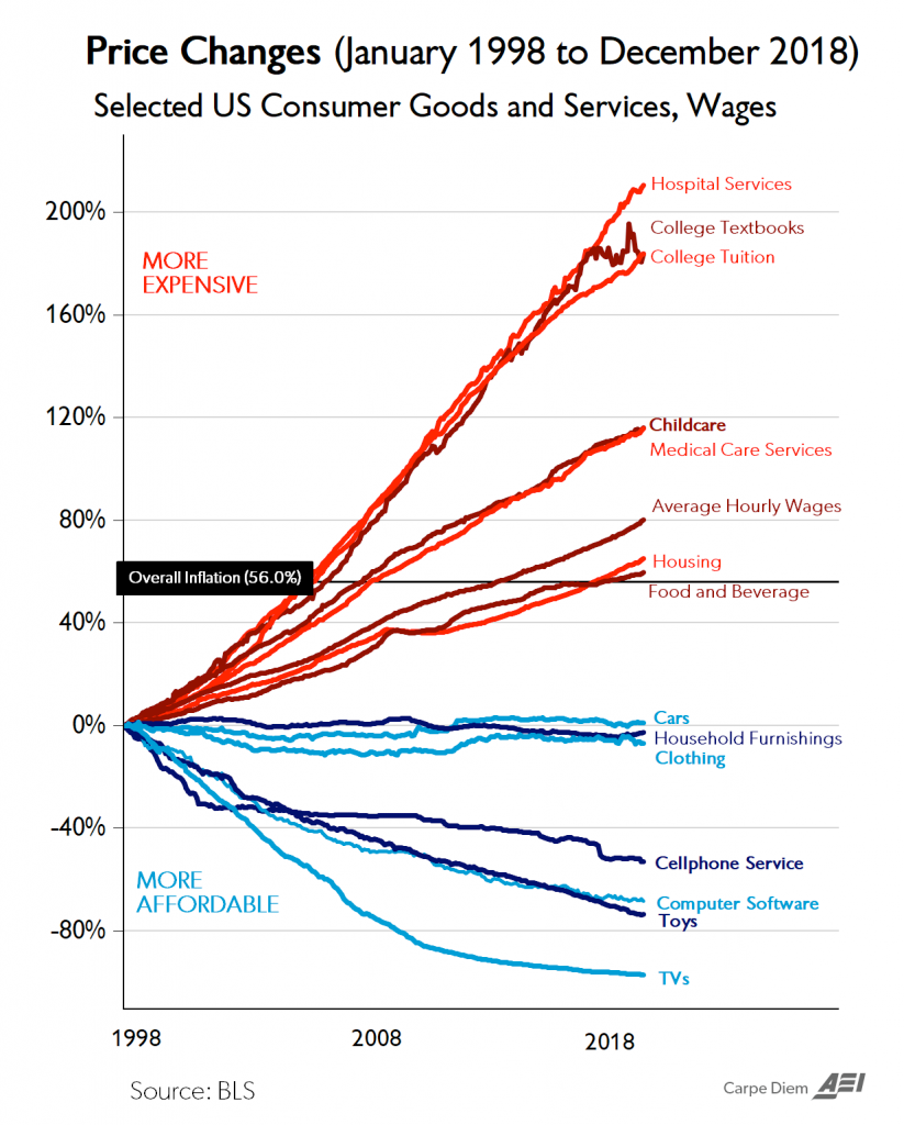 Money printing perturbs capital allocation. When money is printed, it has to go somewhere. As you can see from the chart, the last 27 years has seen a flow of money from the monetary spigots into the market, which has driven up the costs for things that are deemed essential to life in 2025. Medical care, housing, education, food, and childcare. Saving some money on your big screen TV, smartphone and video games is nice, but it doesn't save you enough to be able to weather the forces of price increases in the highest ticket items that are essential to maintaining a life of dignity.