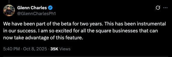 This. This right here is massive. As it stands today, Square supports over 4,000,000 merchants across the United States and every single one of them will be able to log into their Square business accounts tomorrow and decide to automatically convert a portion of their cash flow into bitcoin. If 10% of their US customer base enables this feature that will produce 400,000 new small, medium and large businesses that are using bitcoin as a treasury asset that enables them to help grow their businesses. Don't take it from me, take it from Glenn Charles, who has been part of Square's beta test of this product for the last two years.