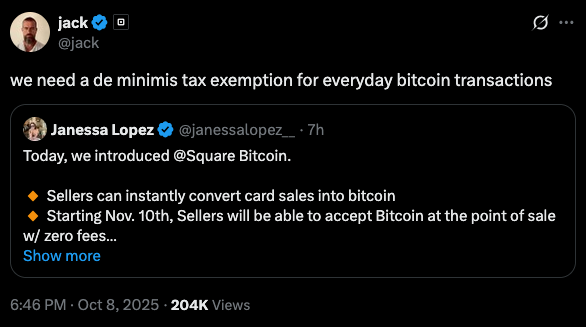 The next thing to check off the list is getting a de minimis tax exemption for bitcoin payments. It looks like Jack is putting the pressure on.