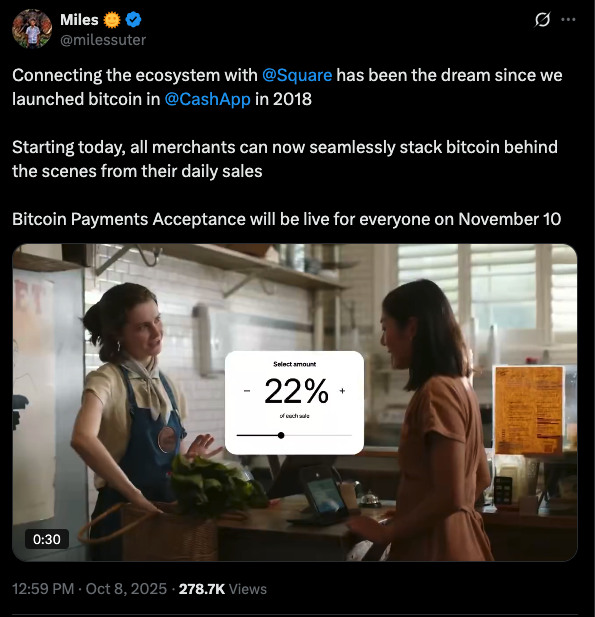 This is the type of "corporate" bitcoin adoption you love to see. Bitcoin is an asset that can help small businesses in ways that most people cannot even fathom. I know from experience, this small (but mighty) media company has benefited massively from our bitcoin treasury, our ability to accept bitcoin for payment and our ability to pay employees and contractors in bitcoin. Opening this up to 4,000,000 businesses overnight cannot be overstated. Most importantly because Square is making bitcoin a first-class citizen throughout the experience, where other payment processors and point-of-sale systems make it hard for their customers to integrate bitcoin throughout the business stack.