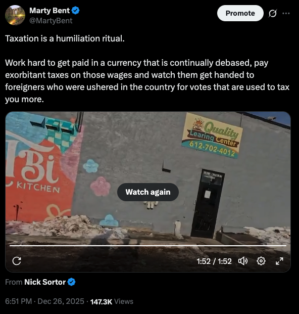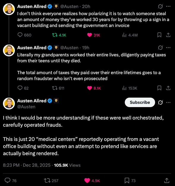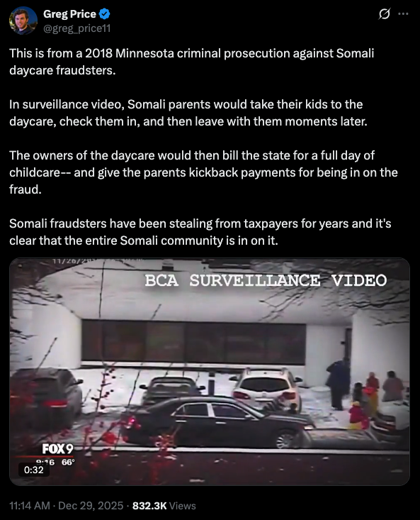 This has been an objectively illuminating, enraging and humiliating week for the American taxpayer. A 23-year old YouTube journalist by the name of Nick Shirley dropped an investigative report on the child daycare and medical transportation fraud taking in Minneapolis, Minnesota by the insurgent Somali community, which has been greatly supported by Democratic leadership in the state and at the federal level. I'm sure most of you have seen the story already and understand the details. If not, you need to get out from under your rock every once in awhile.