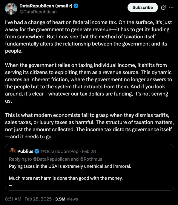 I'm not going to pretend to have a plan for organizing a tax revolt. That's not my skill set. However, I feel what is needed right now is the courage to say this out loud and let others know that you are not alone, you are not insane, and we don't have to live like this. The income tax was supposed to be limited and temporary when it was enacted in 1913. It's been 112 years, has become unbounded and is doing more significantly more harm than good. The incentives of the income tax are such that this was always destined to be the end state.