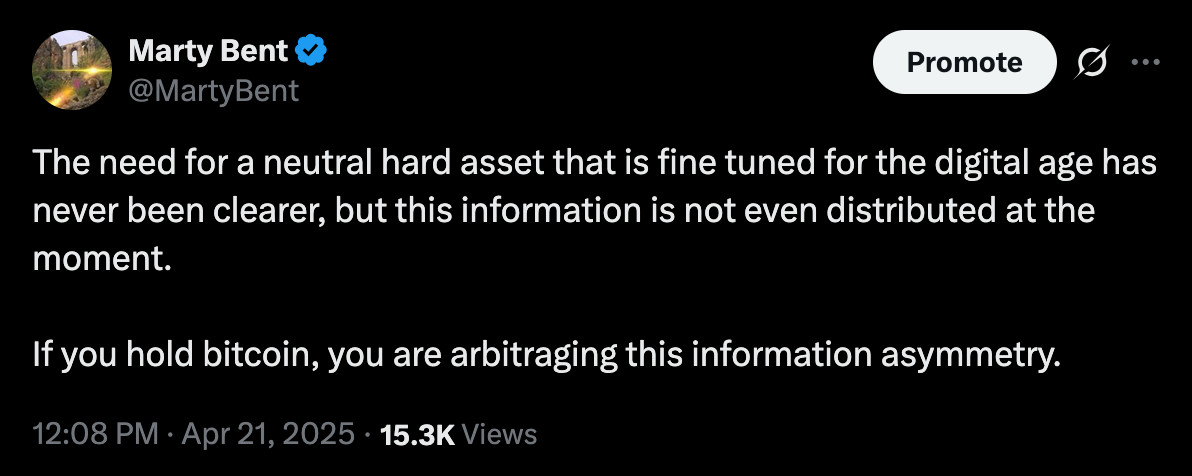 I think many people in bitcoin often take for granted the amount of information asymmetry they have. This is evident by the hoards of bitcoiners complaining online that the number isn't going up high or fast enough at any given point in time. While it is clear to us that the need for a neutral hard asset that is fine tuned for the digital age has never been higher, this information has only been distilled among a very small minority of the global population.