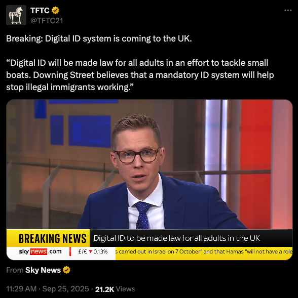 Luckily for us, this hasn't happened in the United States and hopefully it never does. Though, the push for a Real ID for travel and the Treasury Department and FinCen pushing to expand the Patriot Act to include digital assets is a bit worrisome and prerequisites to a full on digital ID system. It will be important to stay vigilant and make sure things don't continue moving toward an even more burdensome surveillance state. Unfortunately for our friends across the pond in the United Kingdom, the era of digital IDs seems to be upon them.