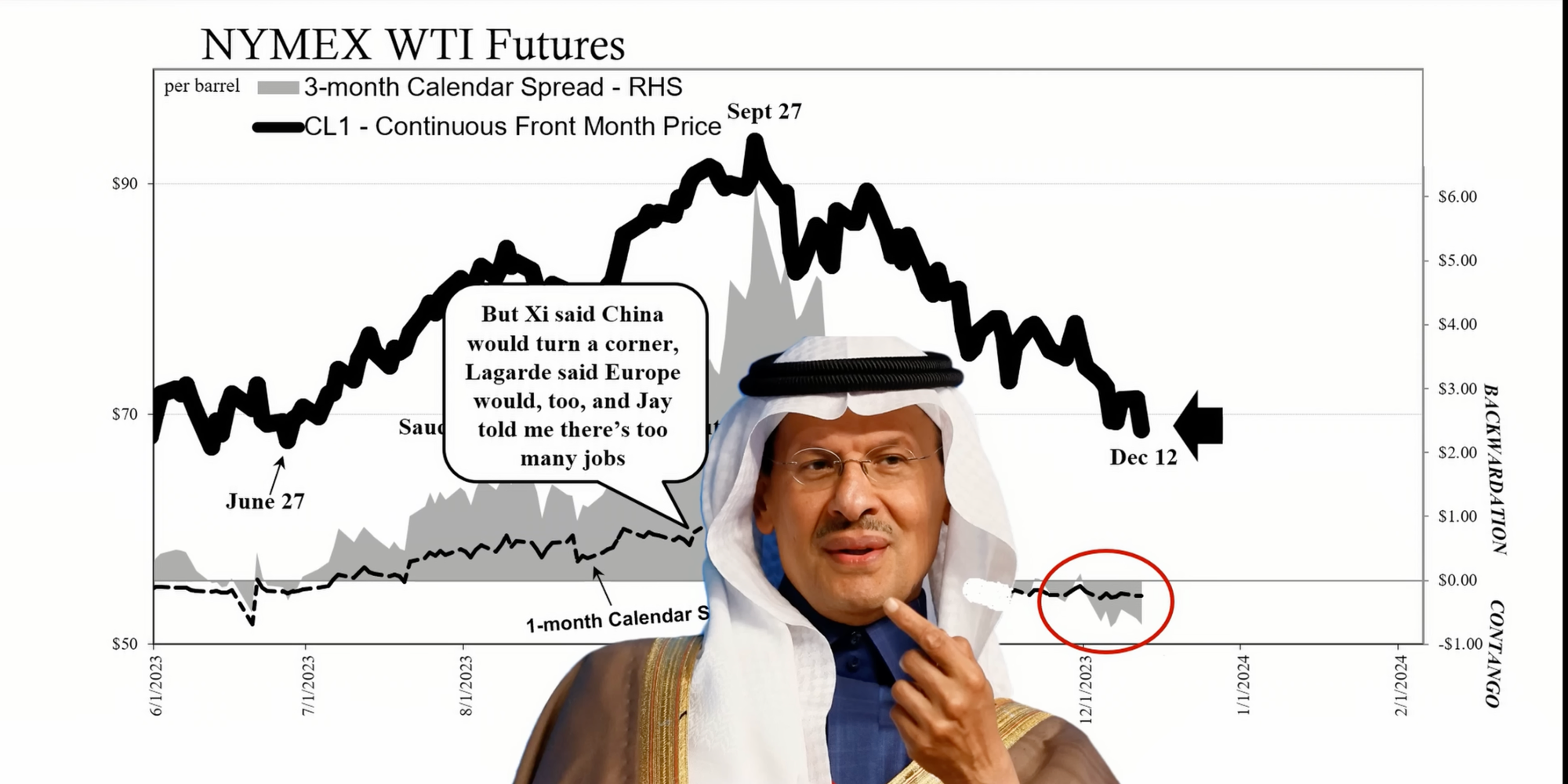 In the latter months of 2023, crude oil prices experienced a significant sell-off, aligning with a surge in bond yields. WTI futures prices reached a low of $68.80 on December 12th, and the market structure shifted into a contango state, despite OPEC's production cuts. By December 19, the WTI futures curve indicated a contango of $1 at the crucial three-month spread.