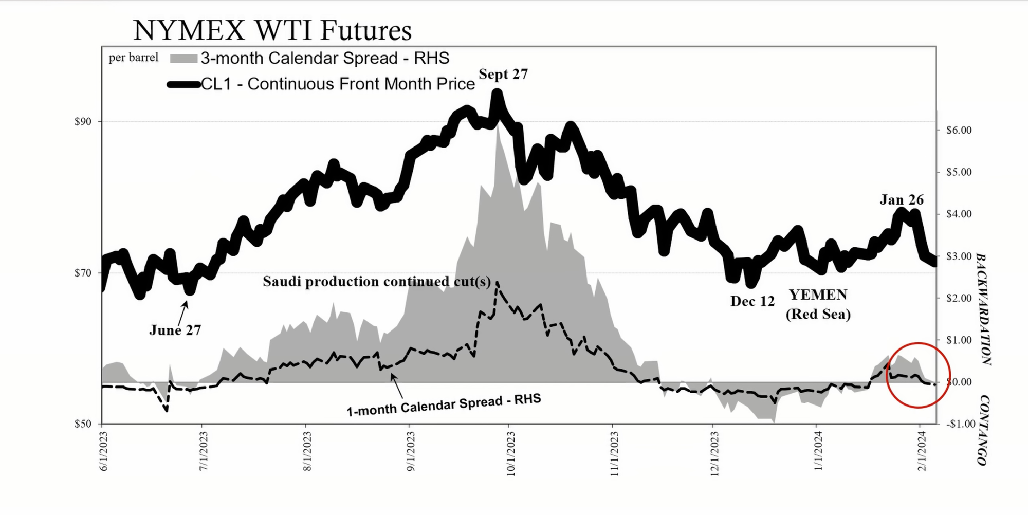 Despite temporary backwardation in January 2024, the IEA reported a further slowdown in global oil demand growth to 1.7 million barrels per day year-over-year in Q4 2023. As of early 2024, WTI futures have declined to $71.50 and returned to a contango state, suggesting a focus on economic fundamentals over geopolitical tensions.