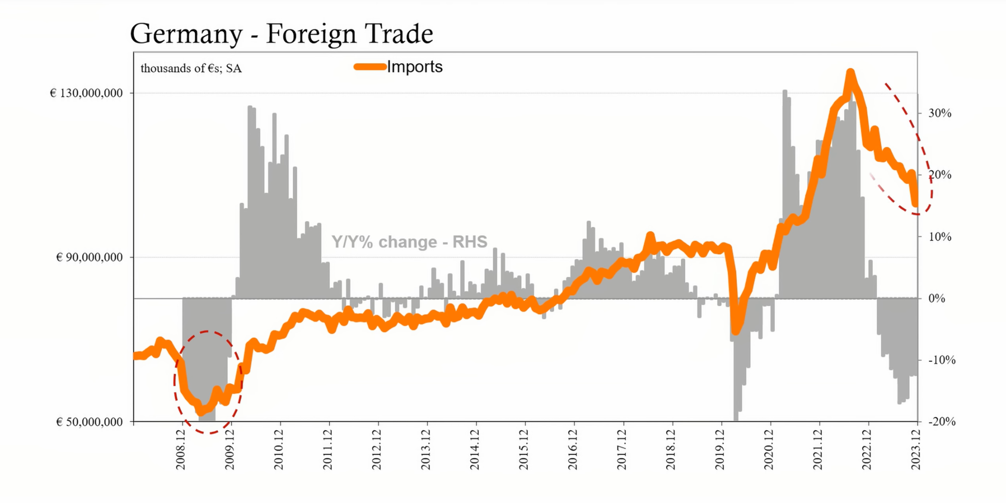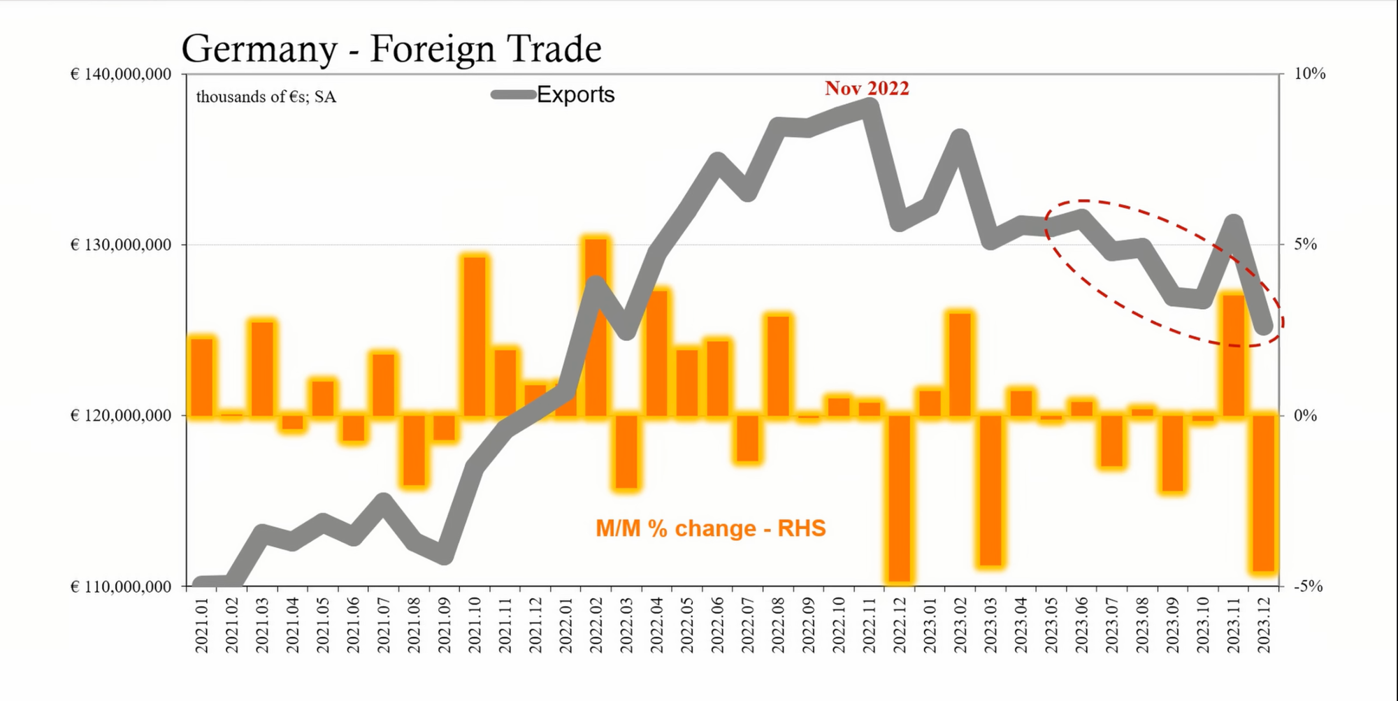 Germany's trade statistics for December 2023 indicated a sharp decline in exports by 4.6% and an even more alarming drop in imports by 6.7%. This downturn is indicative of a broader global trade recession, with Germany's economic performance serving as a key indicator of global economic health.